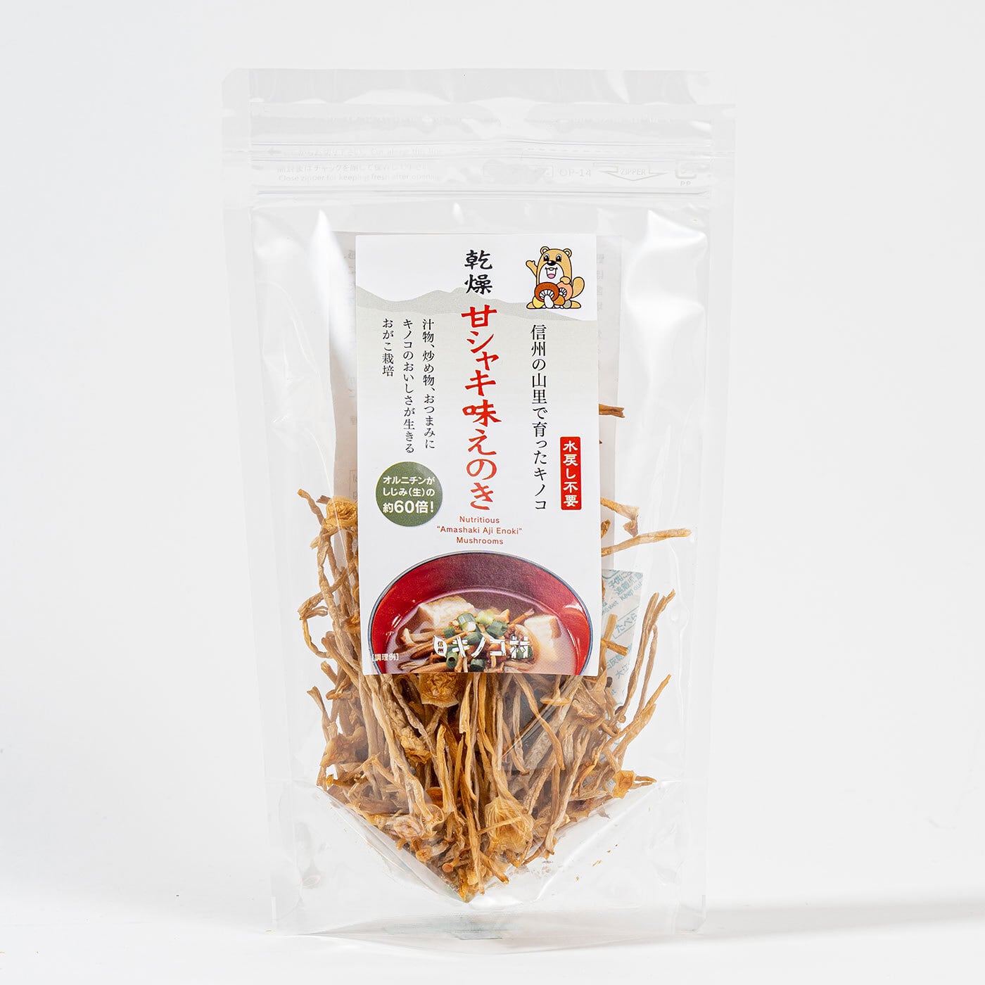 新鮮採れたての「甘シャキとらさんえのき」を農場で乾燥・パックした物が甘シャキえのきとなりました。おいしさや滋養分をたっぷり含んだ乾燥キノコです。